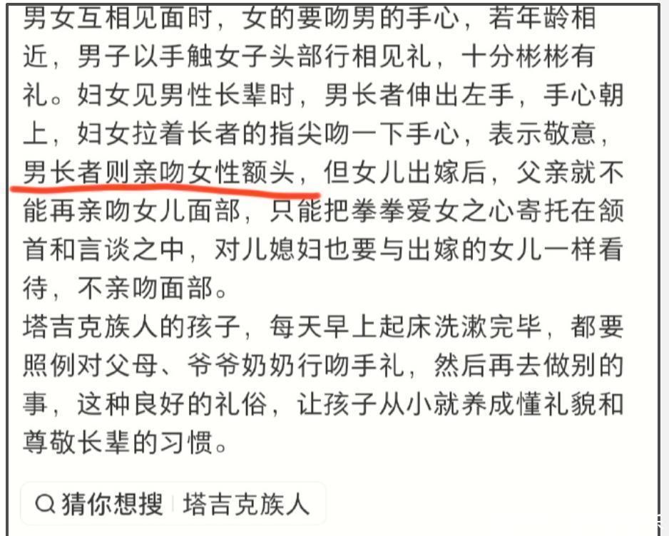 还有网友扒出当地的习俗,称男长者确实可以亲吻女性额头,但是女儿出嫁后,父亲就不能再亲吻女儿面部了。说明即便是当地的习俗,女孩长大后,也是不建议男长辈亲吻面部的。更何况沙溢和宋雨琦只是录综艺,若他真的亲吻了宋雨琦的面部,可以说很没分寸了。